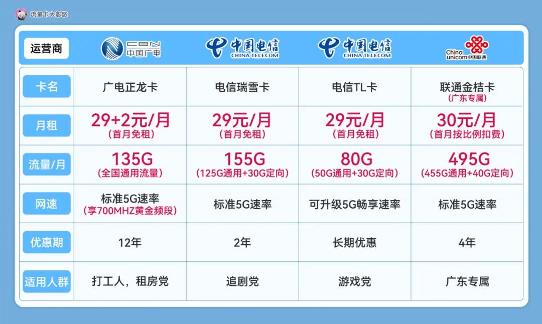 • 29元月租,每月到账流量80G,月租、流量长期不变。